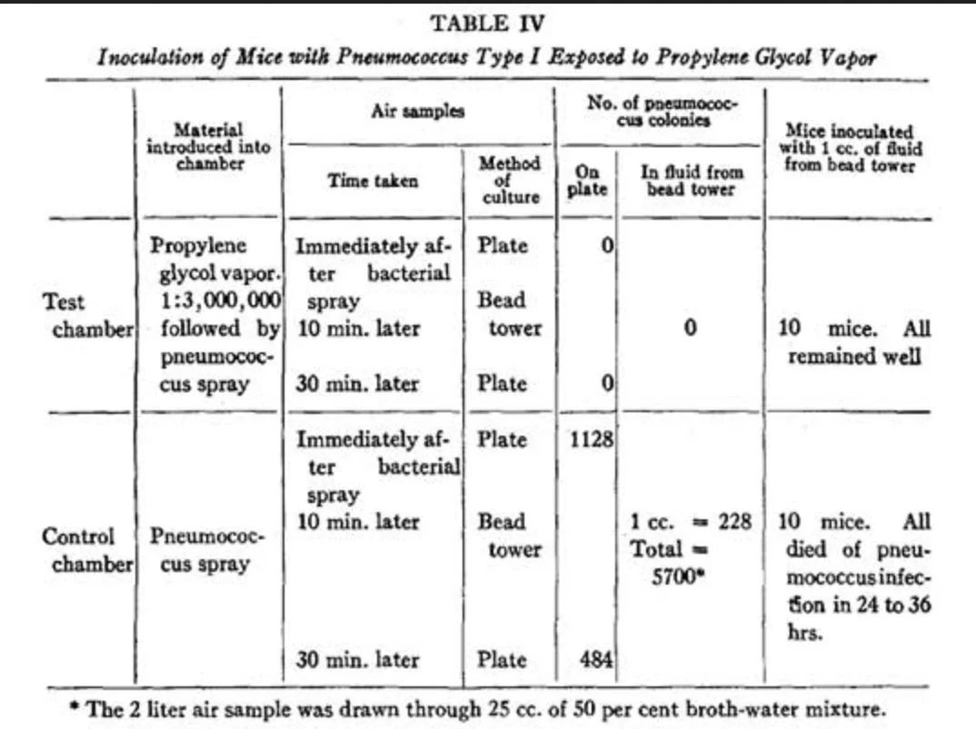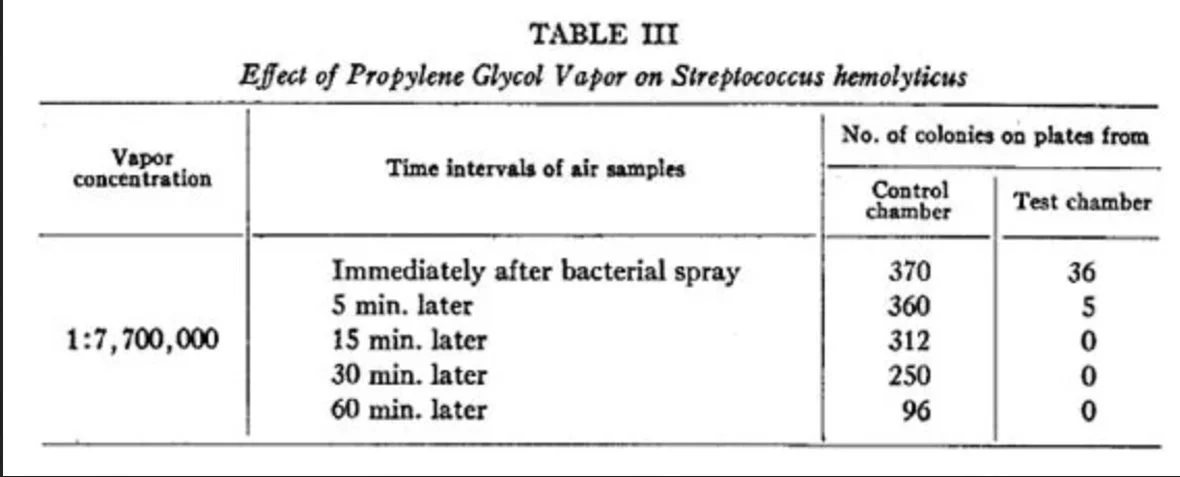 این آزمایش نتیجه گرفت هوای حاوی پروپیلن گلیکول انواع باکتری ها را از بین میبرد.بخار پروپیلن گلیکول نامریی، بدون بو و غیر تحریک کننده و اساسا غیر سمی است.